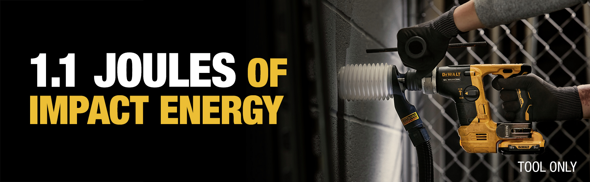 Tackle demanding jobs with this high-performance XXTREME 12V MAX Brushless 9/16 in. SDS PLUS Rotary Hammer. The DEWALT brushless motor and durable German-engineered mechanism deliver 1.1 Joules of impact energy. The lightweight and compact design makes this tool ideal for mounting strut, installing conduit, hanging fixtures, pipe clamp anchoring, and maintenance repair operations applications when combined with lightweight masonry screw anchors. This rotary hammer becomes OSHA Table 1 Compliant when used with the DWH200D dust shroud and DWH161D1 dust extractor. Battery and charger sold separately.
