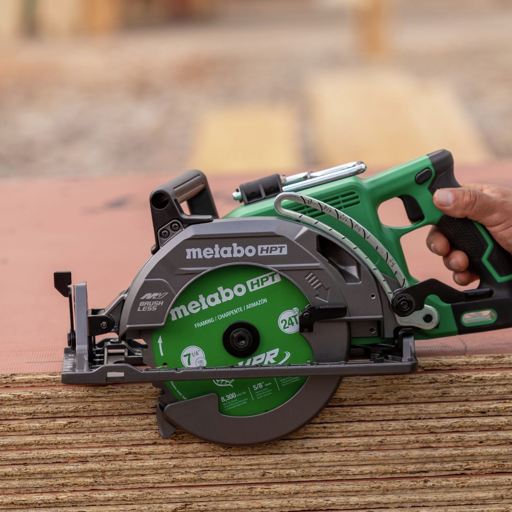 This 36V MulitVolt 7-1/4 in. cordless rear handle circular saw includes the new VPR 24 tooth framing blade and a convenient tool bag. This saw is backed by Metabo HPT’s Lifetime Lithium-ion tool body warranty, providing peace of mind for your purchase. This 36V rear handle circular saw is part of the expanding MultiVolt system of power tools from Metabo HPT. It accepts any MultiVolt battery for extreme power and runtime and can also accept the unique AC adapter (ET36A) to plug in for all day runtime, offering ultimate versatility and power on the GO.